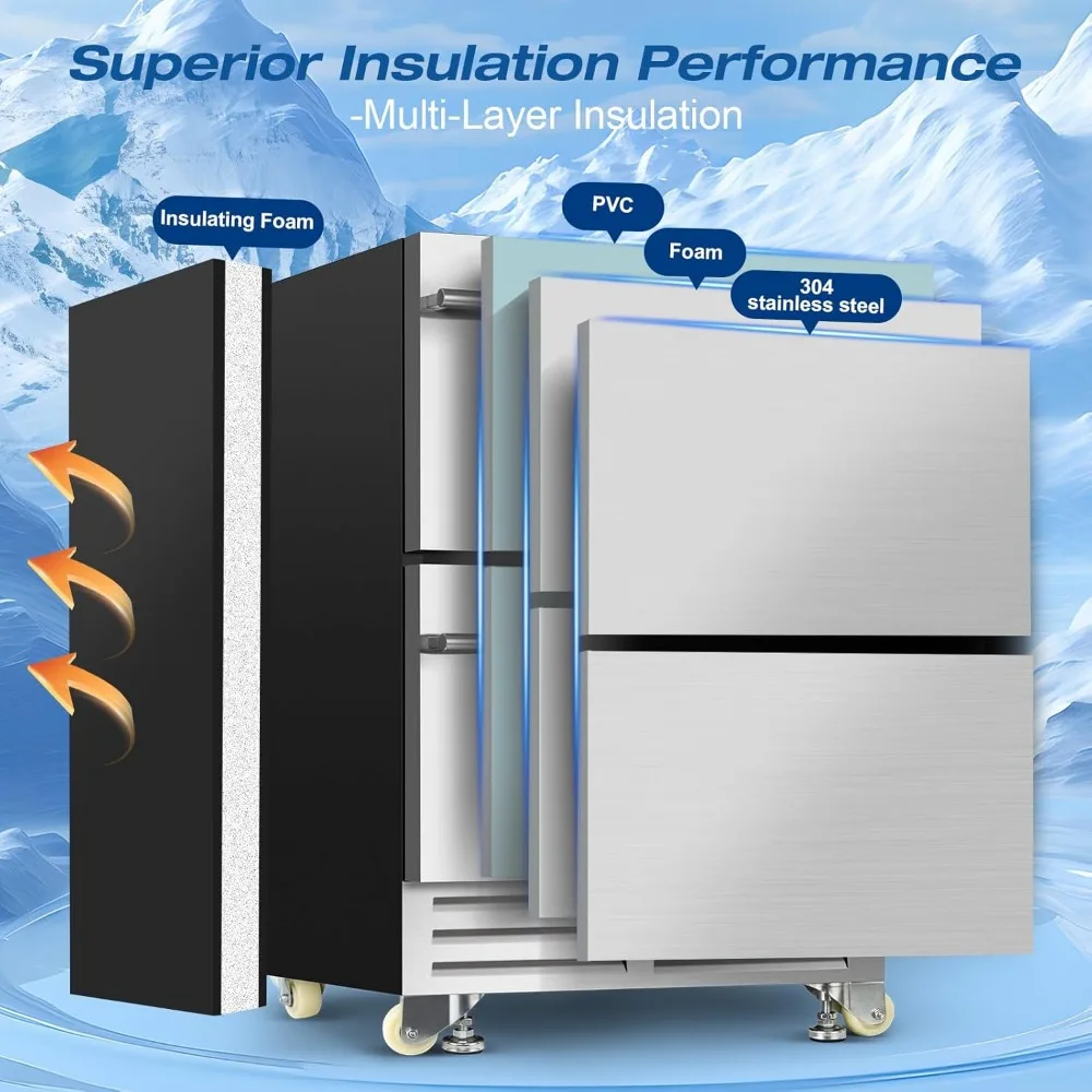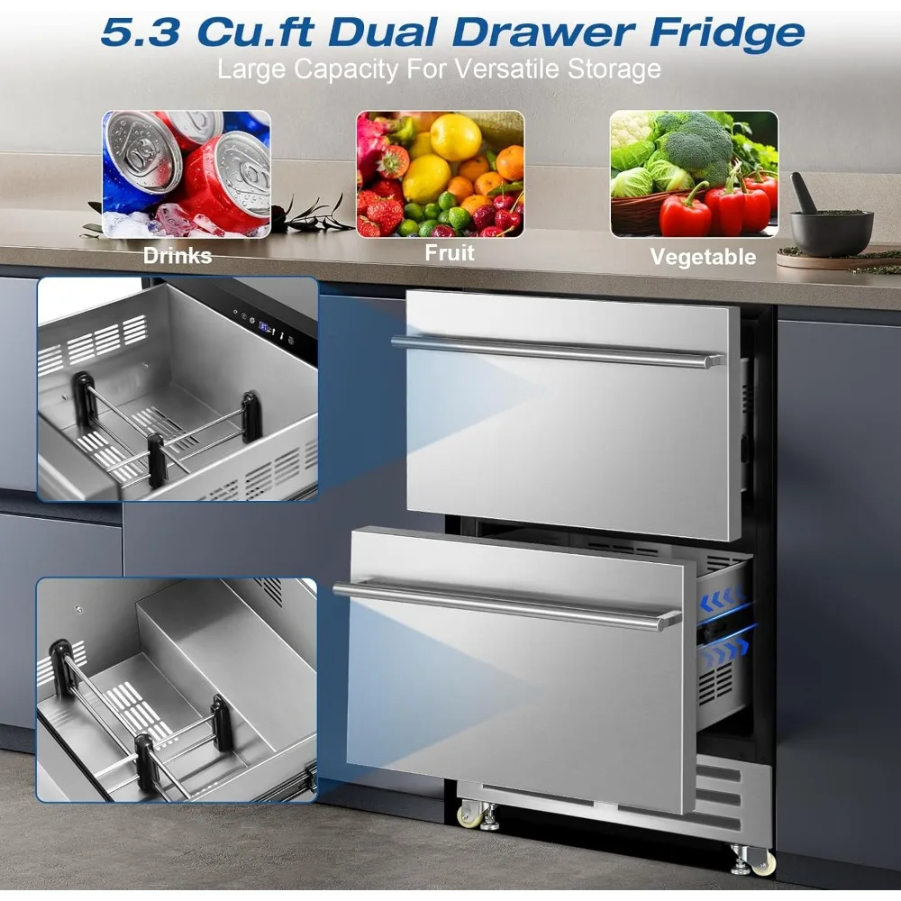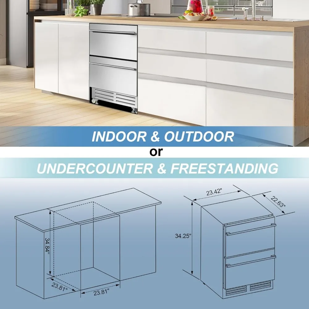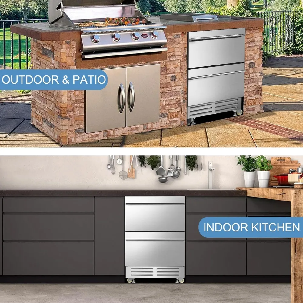 24 Inch Dual Drawer Fridge Under Counter, Stainless Steel Weather-Proof Design Outdoor Beverage Refrigerator