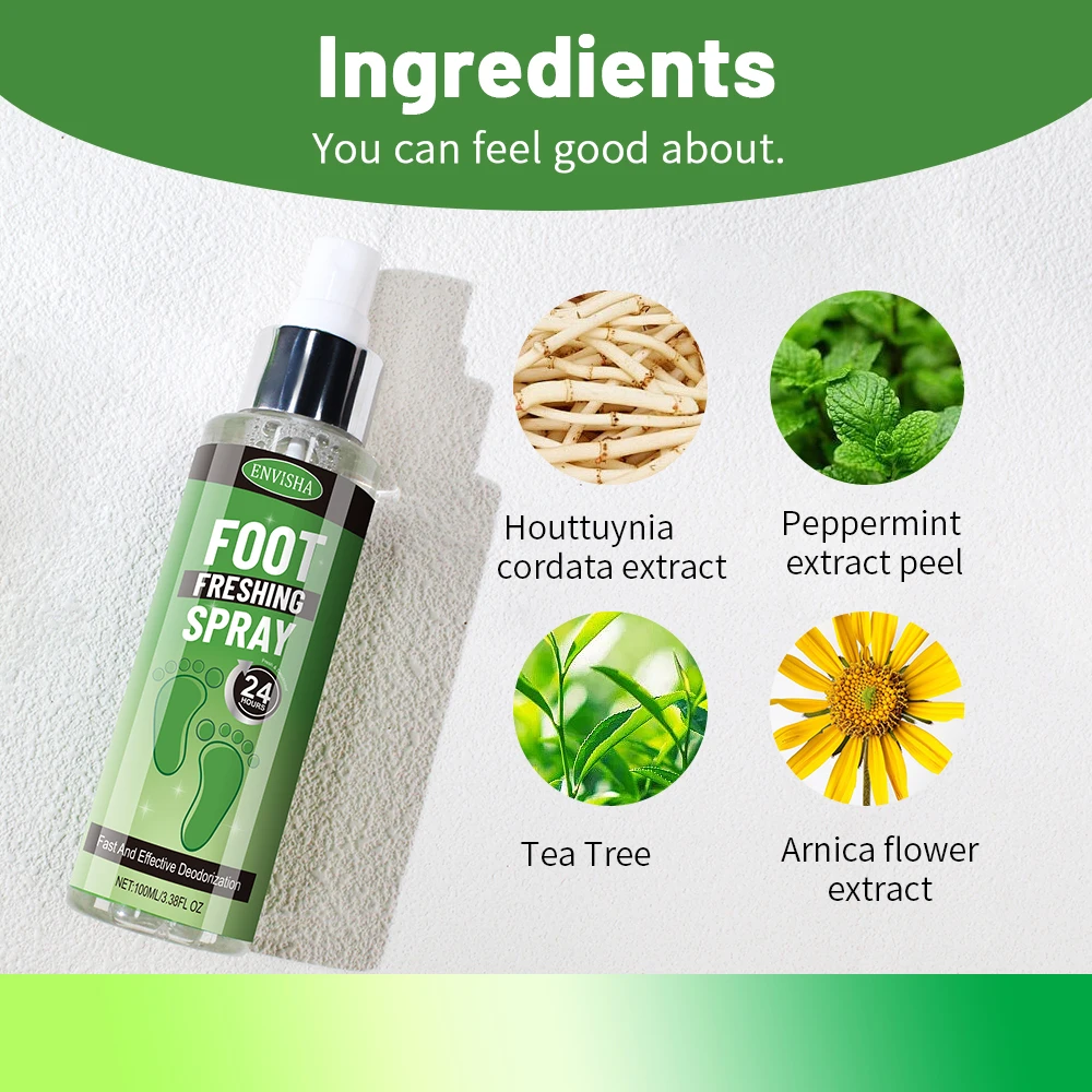Mint and tea tree extract can effectively neutralize foot odor.keep feet fresh and dry, and quickly clean the foot skin. Use on shoes and socks to reduce odor.