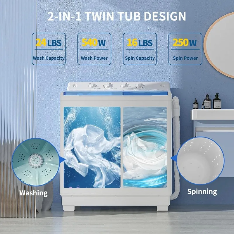 【Large Twin Tub Design】With a 24Lbs wash capacity & 16Lbs spin capacity, this portable washing machine is a fantastic choice for handling a large amount of laundry in one load, such as shirts, jeans, sheets, etc. Its unique feature allows you to simultaneously wash and spin dry your clothes, which simplifies the entire laundry process and saves you time and energy.